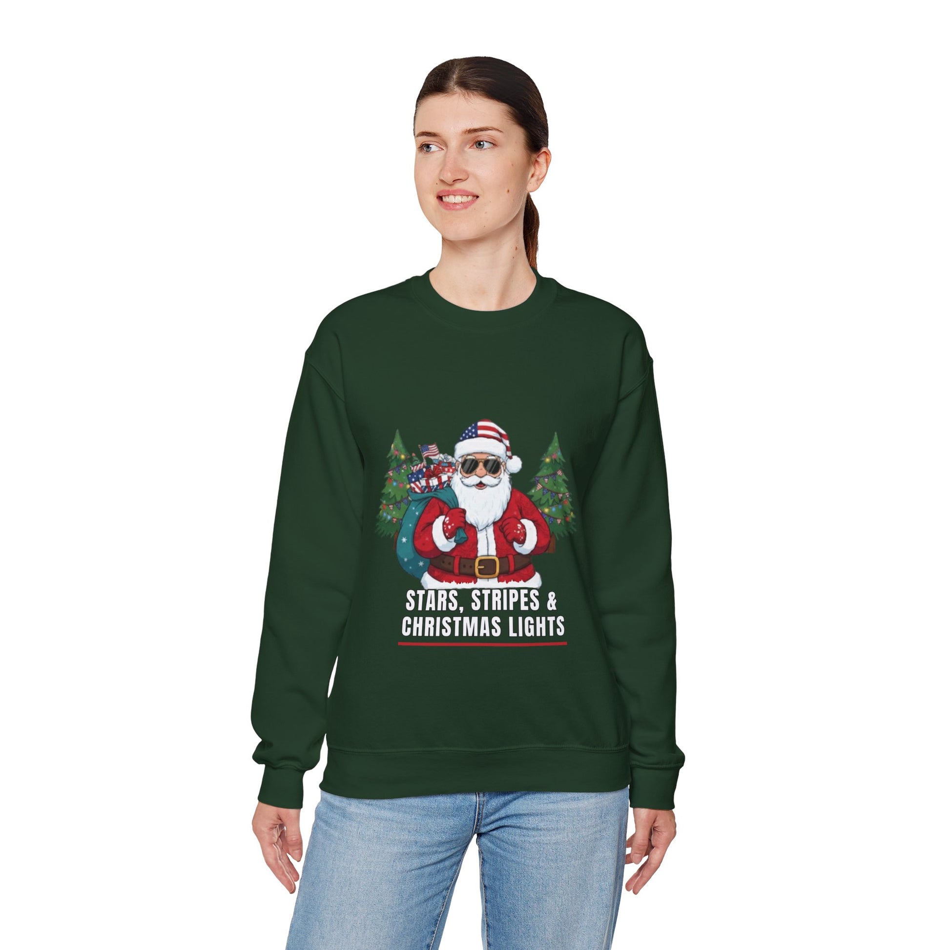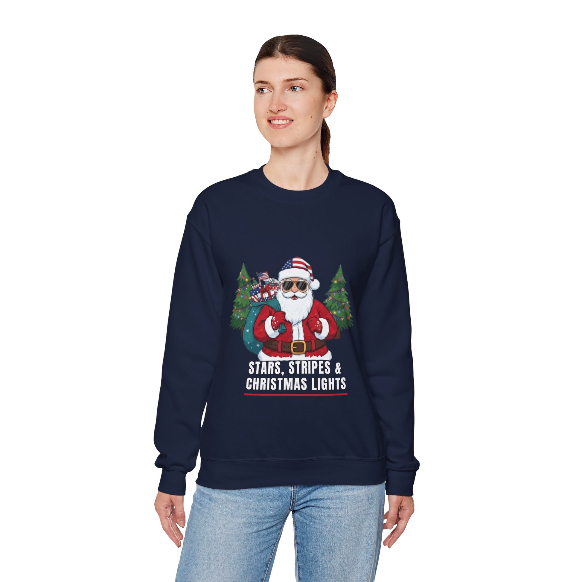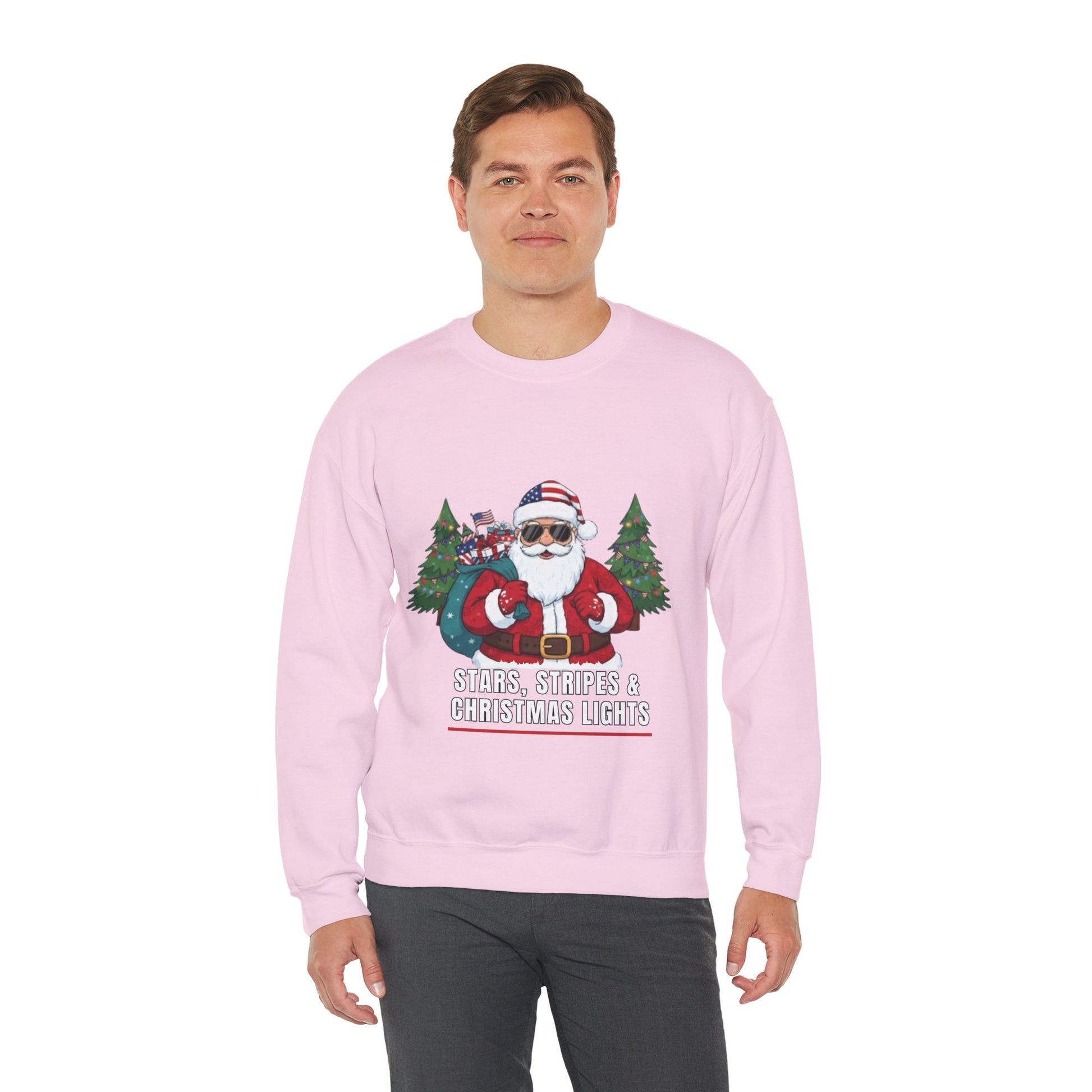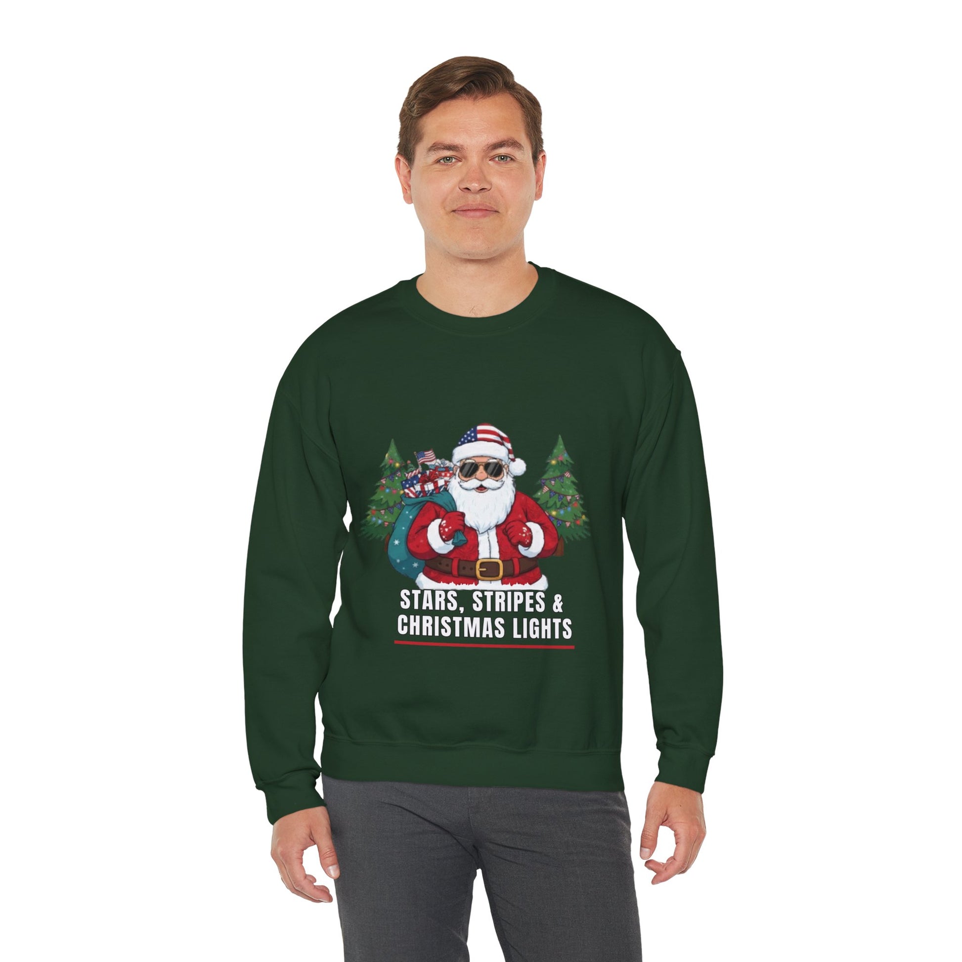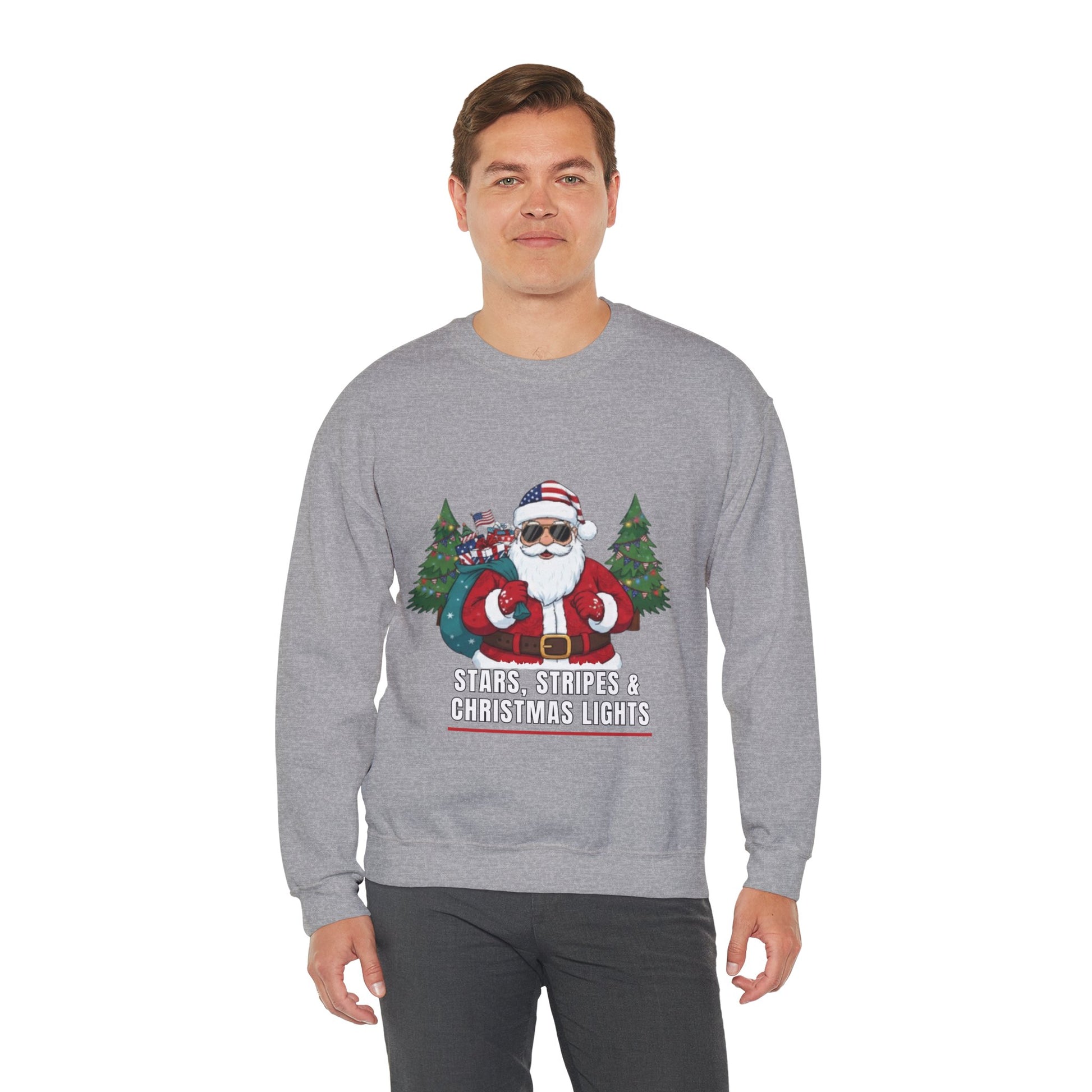 Celebrate American patriotism with this Stars, Stripes & Christmas Lights design on a cozy and durable crewneck sweatshirt. Perfect for holiday parties and gatherings, this unisex sweatshirt is ethically made and comfortable to wear. Ideal for adults looking for a festive and stylish option.